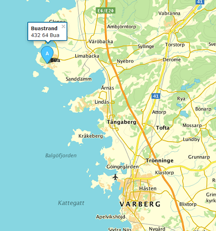 Från E6/E20: Ta avfart 56 (ca 2 mil norr om Varberg) mot Bua Veddige Ringhals.